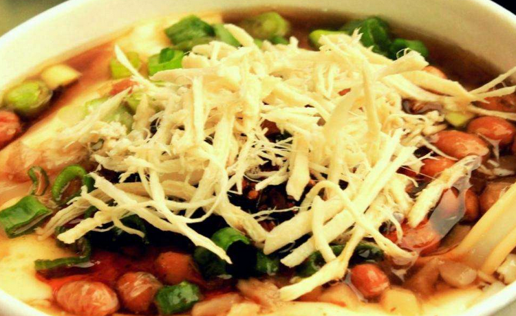 豆腐脑是由黄豆浆,过滤去渣烧开,倒入放有一定比例石膏水的缸内轻轻搅拌,逐渐形成的。食用时,另加入用金钩墨鱼等调成的鲜汤,再加上鸡丝等佐料即成鸡丝豆腐脑。它色鲜味美,香气扑鼻,回味无穷。若再放蹼醋,则既开胃,又增进食欲。